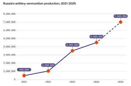 Служба зовнішньої розвідки Естонії повідомила про значне зростання виробництва боєприпасів у Росії. Минулого року російські заводи випустили понад 7 мільйонів снарядів, мінометних мін та ракет, що значно перевищує показники 2024 року (4,5 мільйона одиниць).