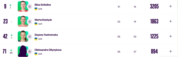 - Даяна Ястремська піднялася на 42-ге місце (+1);