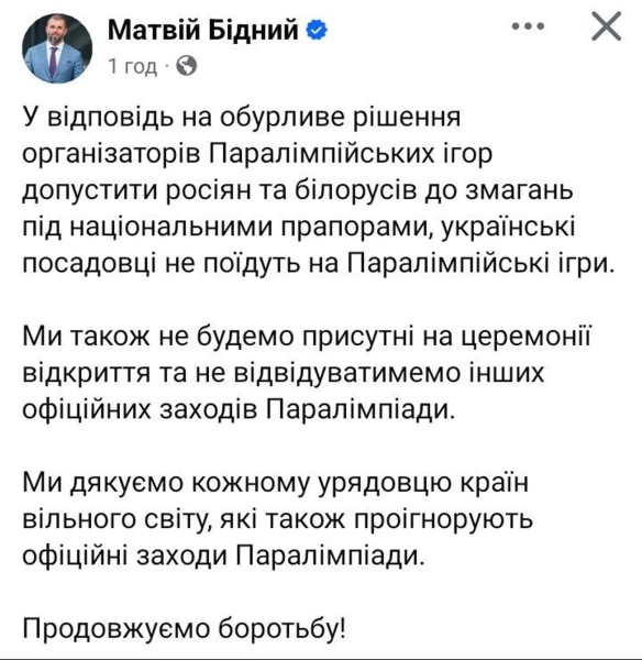 Українські представники влади не відвідуватимуть Паралімпійські ігри. Це рішення зумовлене рішенням організаційного комітету допустити спортсменів з російської федерації та республіки білорусь до участі у змаганнях під національними прапорами. Про це повідомив міністр молоді та спорту України Матвій Бідний на своїй офіційній сторінці у Facebook, передає УНН.